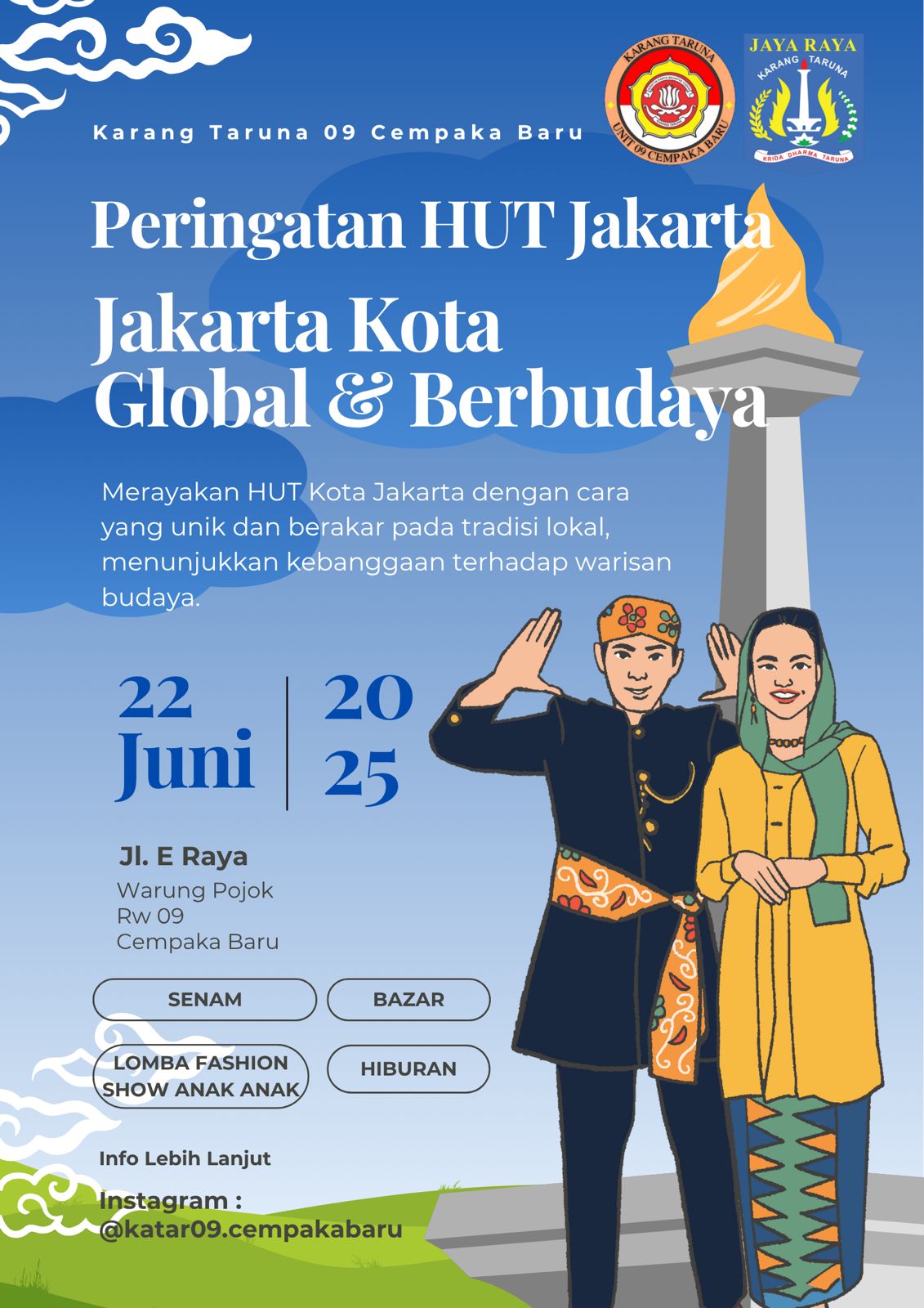 Infokemayoran.id – Dalam rangka memeriahkan Hari Ulang Tahun (HUT) DKI Jakarta ke-498 yang mengusung tema “Semarak Jakarta Mendunia”, Karang Taruna Unit 09 Kelurahan Cempaka Baru, Kecamatan Kemayoran, Jakarta Pusat akan menyelenggarakan acara spesial bertajuk “Bazar dan Hiburan Rakyat”. Kegiatan ini akan berlangsung pada: